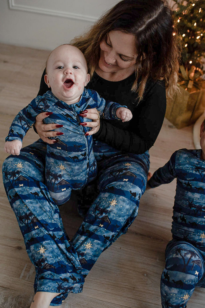 Bring the nativity story to life — not just for your children, but for the whole family — with our Star of Bethlehem Adult Pajama Pants. Designed to coordinate with our beloved children’s line, these unisex lounge pants feature hand-painted watercolor art of the Holy Family beneath the Christmas star, making them the perfect way to match meaningfully this season.